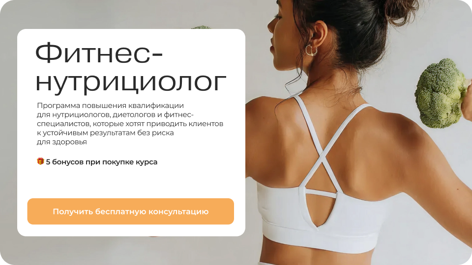 Если хотите понять, как с помощью питания можно управлять весом, поддерживать метаболическое здоровье, корректировать гормональный фон — приглашаем на курс МИИН «Фитнес-нутрициолог». В нем — системное представление о том, как еда влияет на состав тела и работу внутренних органов.